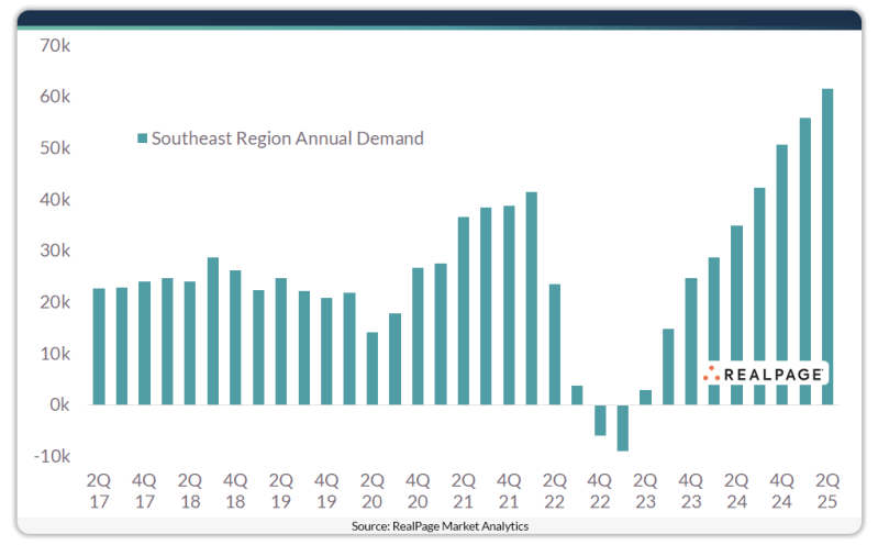 Annual absorption topped 60,000 units in the Southeast in the year-ending second quarter. That was the region’s strongest apartment demand reading in decades. The Southeast has been enjoying an outsized performance relative to other regions, inspired by solid in-migration, resilient job growth and affordability advantages.