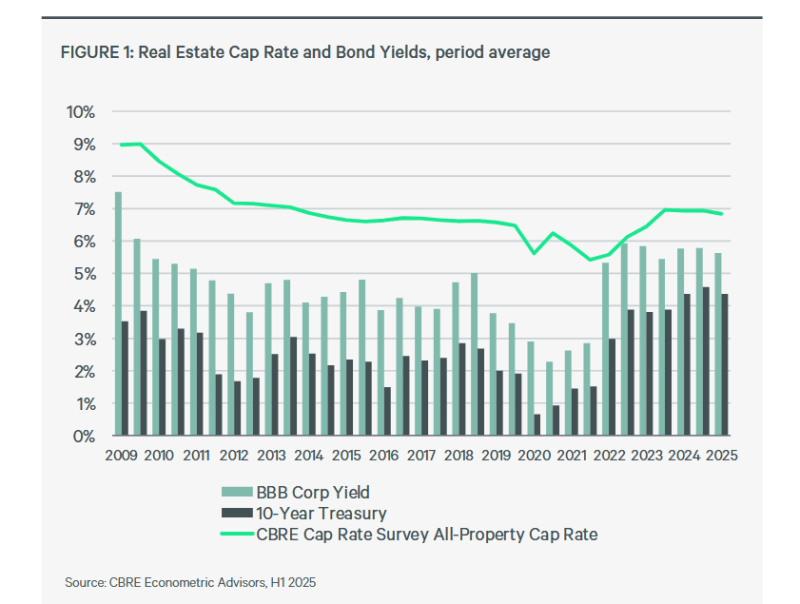 Most graphs show commercial real estate cap rates in relation to the 10-year treasury, but the graph below adds investment grade corporate bond yields.