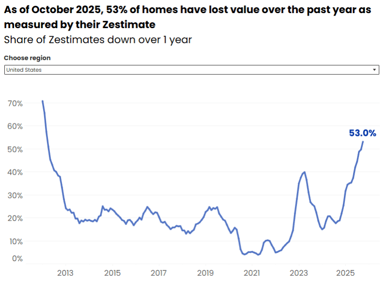 Over the past year, more than half (53%) of homes have lost value, the highest share since 2012. This share has climbed from only 16% just a year ago.