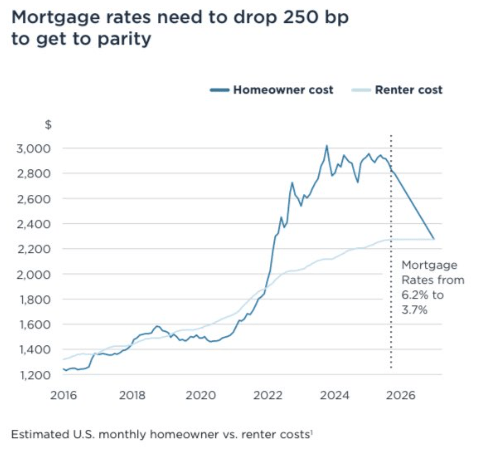To restore cost parity between owning and renting, mortgage rates would need to drop by about 2.5% from current levels, from 6.2% to 3.7%, holding other variables constant.