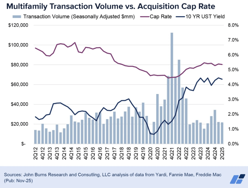 Trailing 4-quarter multifamily transaction volumes are 24% lower than 2018/2019 on a dollar basis and 42% lower on a unit basis.
