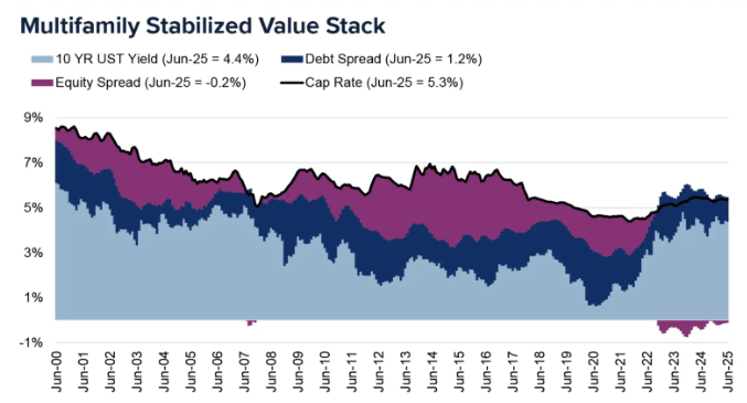 Cap rates are lower than interest rates for the eighth consecutive quarter, meaning debt is dilutive to cash flow upon acquisition. Expense growth has outpaced revenue growth since 2023, negatively impacting NOI growth.