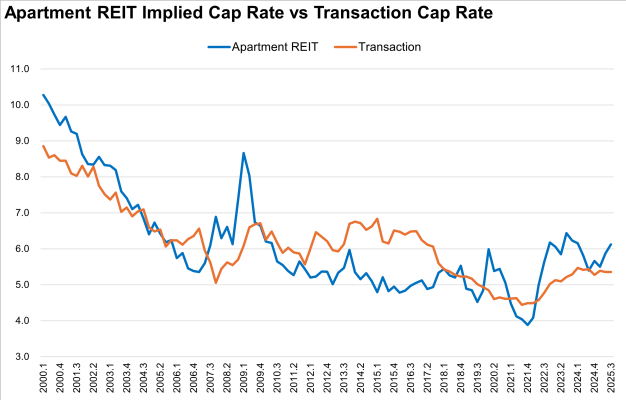 Since 2000, apartment REIT implied cap rates and private transaction cap rates have both averaged ~6.2%. REIT cap rates were lower 48% of the time, and higher 52% of the time. When REIT cap rates are higher, it generally means the stock trades at a discount to Net Asset Value (often determined using the transaction cap rate), implying the underlying real estate is more valuable than ownership of REIT shares.
