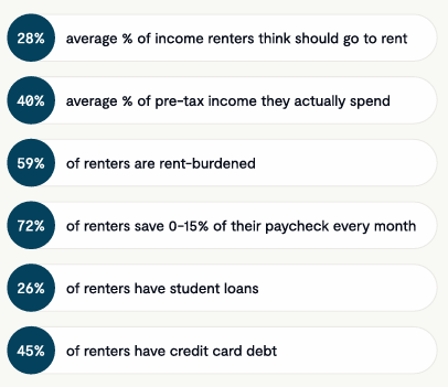 - About 60% renters now spend 40% of their income on rent. Renters paying more than 28% of their income on rent has long been the benchmark for what owners, renters and lenders consider unaffordable.