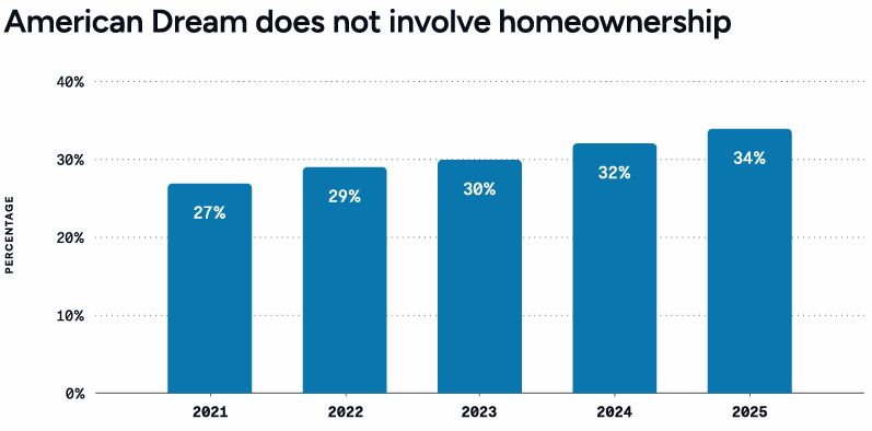 - The share of renters living with non-family, non-partner roommates continued its steady decline, dropping to 19% in 2025 from about 22% in 2022. This trend mirrors a broader cultural shift: singlehood in the U.S. has been rising for decades, reshaping household formation and what adulthood looks like for many Americans.