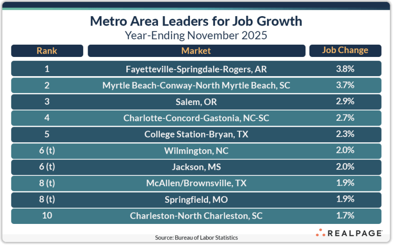 Eight of the top 10 job growth markets had greater growth rates than one year ago, led by Myrtle Beach with a 250-bps increase.