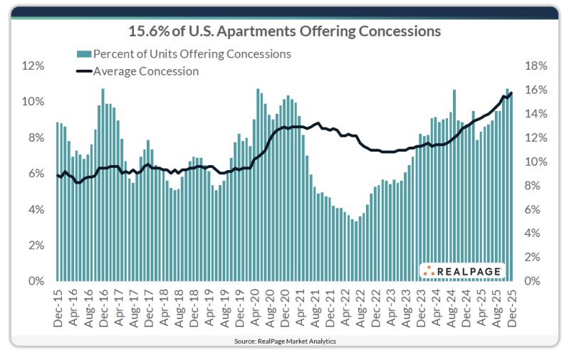15.6% of stabilized apartments offered concessions in December, and the average December discount of 10.5% held essentially steady with October and November.