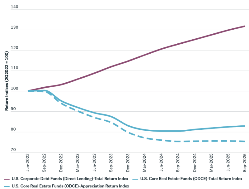 - Cyclical upside potential: Real estate values remain below prior peaks after a significant reset that began in mid 2022. Over this period, private real estate underperformed private corporate debt; if performance were to revert toward historical relationships, closing that gap implies potential upside approaching 60%.