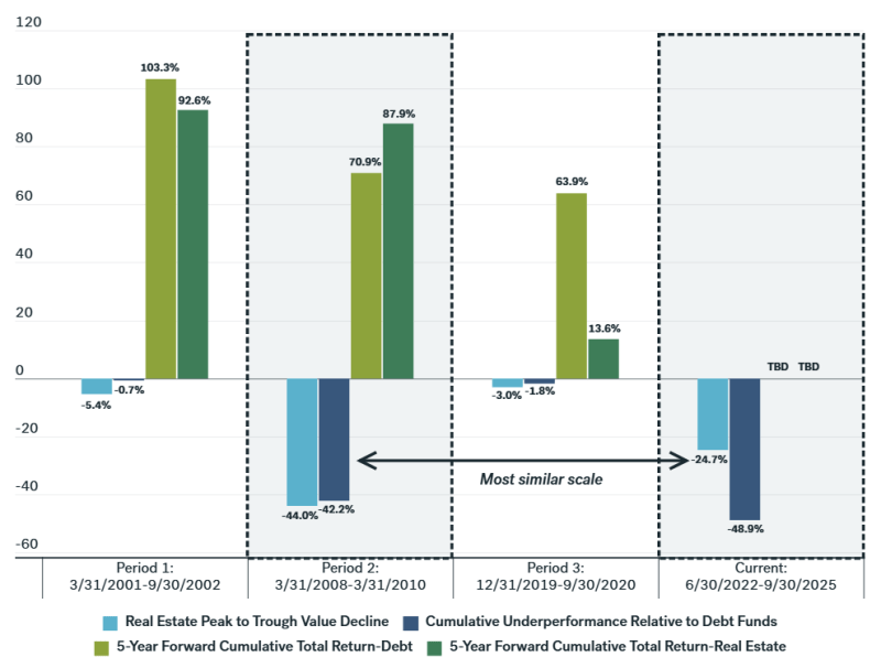 Looking across three comparable downturns, similar resets were followed by nearly 20% outperformance over the subsequent five years. Early signals have been giving a strong read that the turn is underway: core private real estate indices have now posted six consecutive quarters of positive returns after seven quarters of declines, suggesting the trough may be behind us.