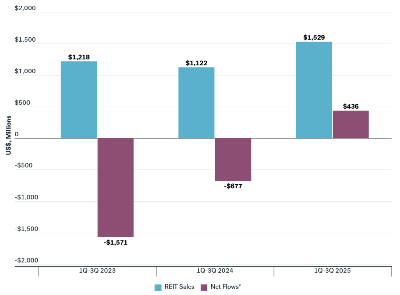 Capital flows show allocators are beginning to move. Among the largest non traded equity REITs, new investment activity has strengthened: capital raised over the first three quarters of 2025 is up 36% versus 2024, and net flows have shifted from negative to decisively positive. These are the kinds of signals we would expect as investors acknowledge the valuation reset and the compelling forward return profile of private real estate.