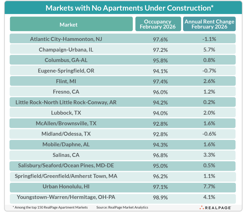 At the end of 2025, there were 16 markets (out of the nation’s 150 largest) that did not have any apartments under construction. That was up from the 10 at the end of 2024 and 6 at the end of 2023.
