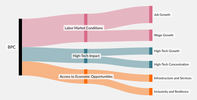 The BPC index is composed of 13 metrics related to short- and long-term trends in the labor market, performance of high-tech industries, and shared access to economic opportunities.
