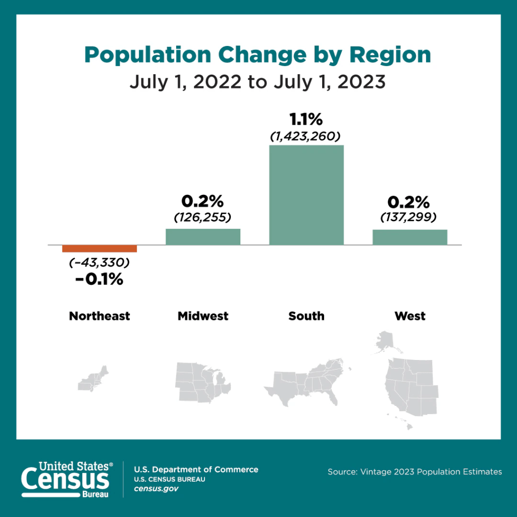 The U.S. Census Bureau released their annual population trends data for 2023 yesterday. Americans continue to leave the northeast with the south experiencing the largest inflow of new residents; accounting for 87% of the nation’s growth in 2023.