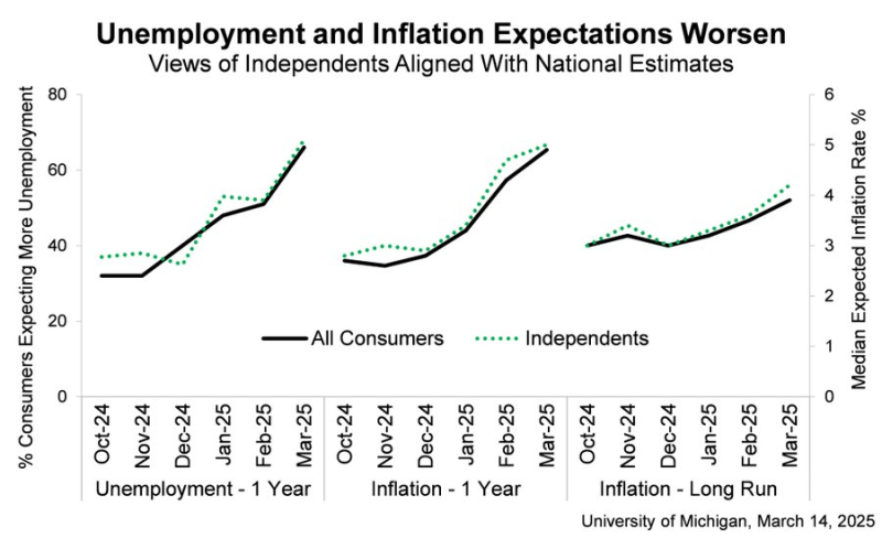 The U.S. unemployment rate hit an interim low of 3.4% in January 2023. From there, it rose to 3.9% in February 2024 then 4.2% in July 2024. Today, the unemployment rate is 4.1%, down slightly from last July but up significantly from January 2023. the labor situation and prospects for growth are worse than the headlines indicate. The household survey, a Labor Department survey different than the employer survey used to calculate the official unemployment rate, showed significant job losses in February. The number of employed individuals per the household survey dropped by 588,000. The Labor Force Participation Rate (total employed divided by total workforce) also dropped from 62.6% to 62.4%.