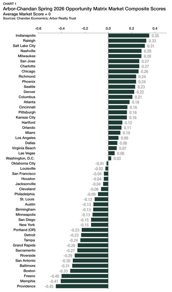 The Spring 2026 Arbor Opportunity Matrix evaluates the nation’s 50 largest metropolitan areas to pinpoint the most attractive areas for multifamily investment right now. The factors include:
