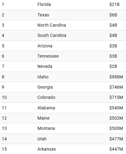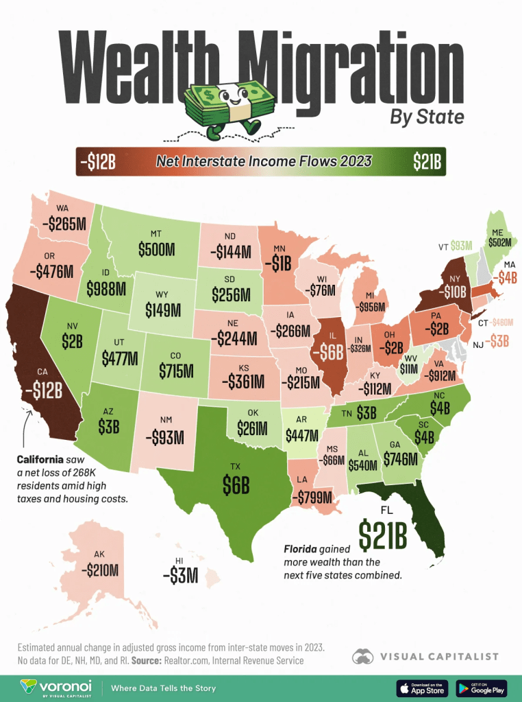 Americans aren’t just moving; they’re bringing billions in wealth with them. This map visualizes net wealth migration by state based on Realtor.com’s analysis of the latest data from the Internal Revenue Service.